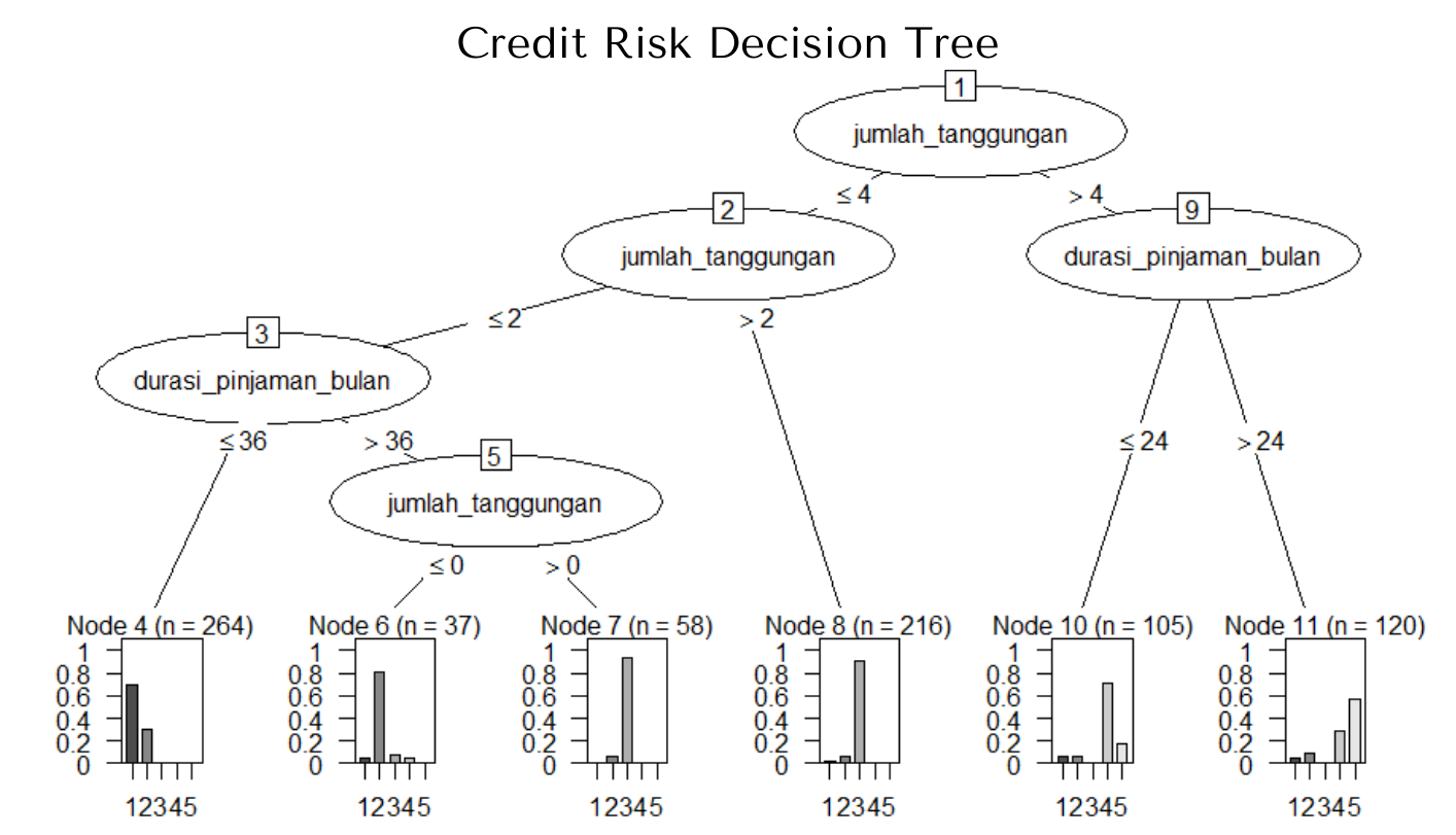 In this project, I was asked to analyze the credit customer dataset from DQLab and built a model for the dataset. The analysis I did was to look at the relationship between the variables and the risk_rating to find the risk tendency. The variables were going to be used for modelling. The model used was a decision tree algorithm from the C50 library.